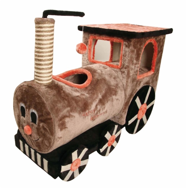 Cute train shaped design. Dangling plush ball adds to the fun.